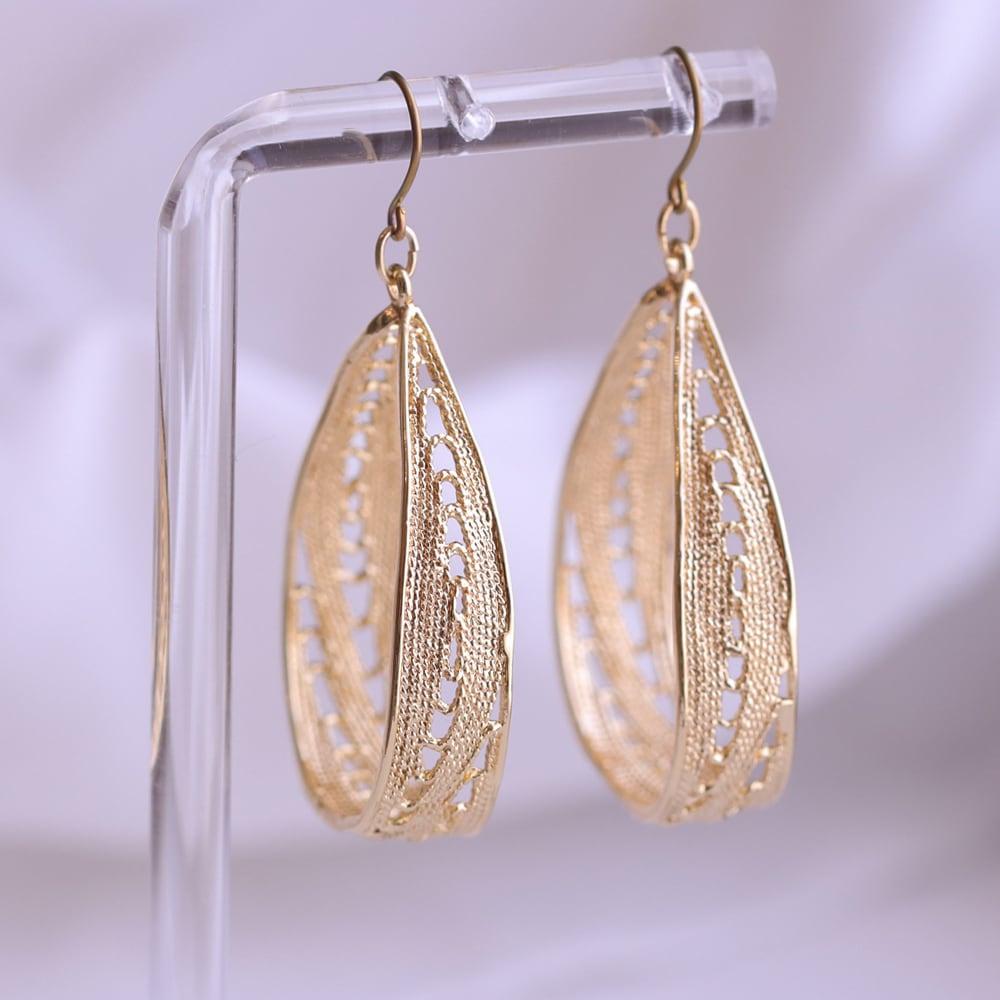 金属アレルギー対応 ピアス 純チタンフック ゴールド ドロップ 雫 透かし彫り レース ボリュームピアス サシェ sache 超敏感肌用 ピアス/商品名:【純チタンピアス】Sandra