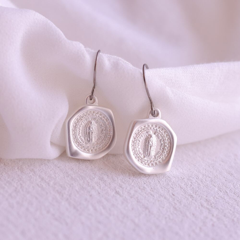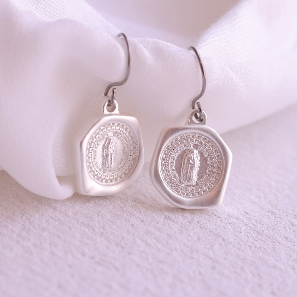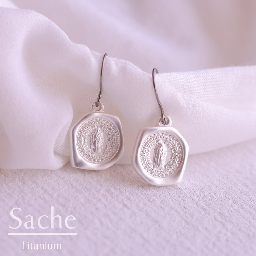 金属アレルギー対応 ピアス 純チタンフック クール メダリオン コイン レリーフ コイン マットシルバー サシェ sache 超敏感肌用 ピアス/商品名:【純チタンピアス】Hexaria