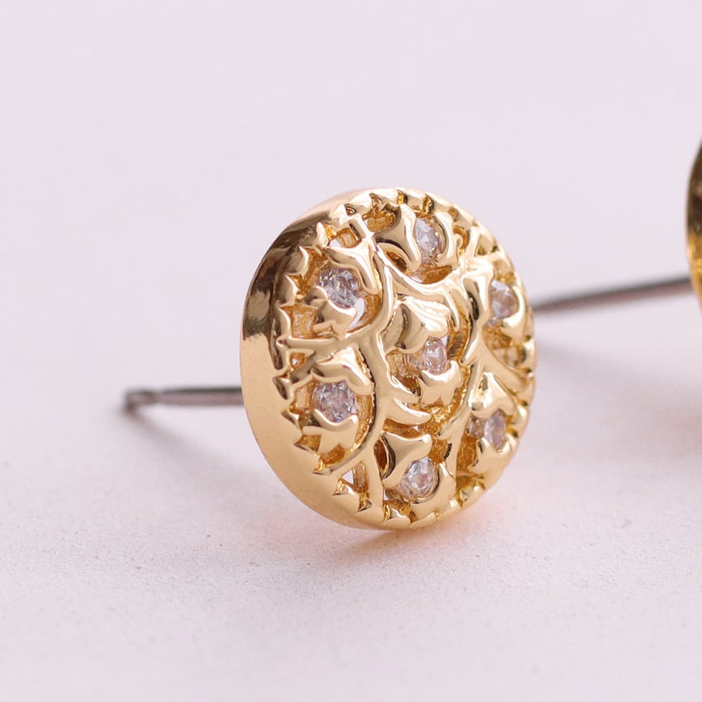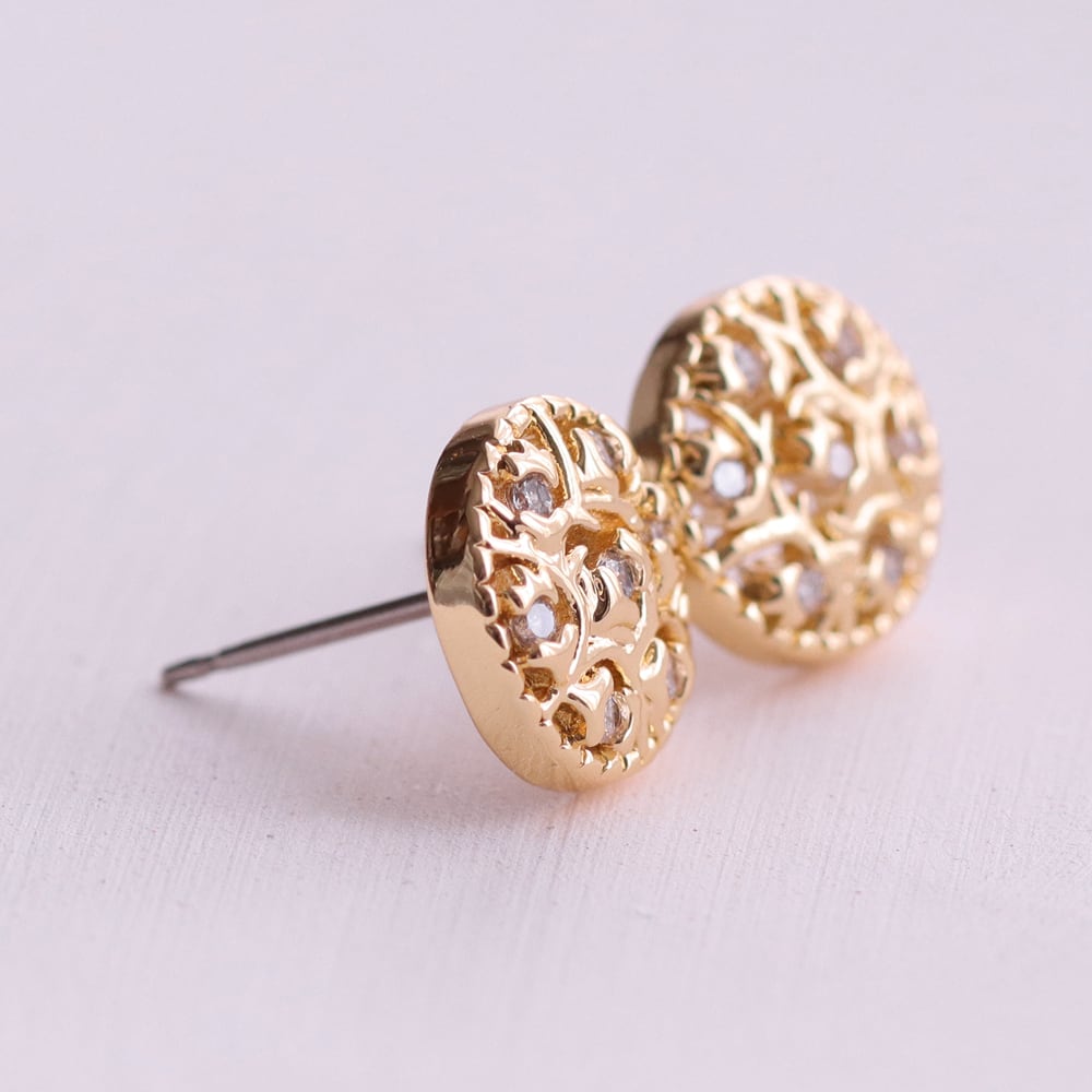 繊細なツタと小枝が輪になったリースモチーフに、露のようなストーンをちりばめた上品デザイン。小さめのスタッドピアス(ポストピアス)は耳に沿うすっきりシルエットで、オフィスやデイリーはもちろん、きれいめコーデやちょっとしたお呼ばれにもマッチします。