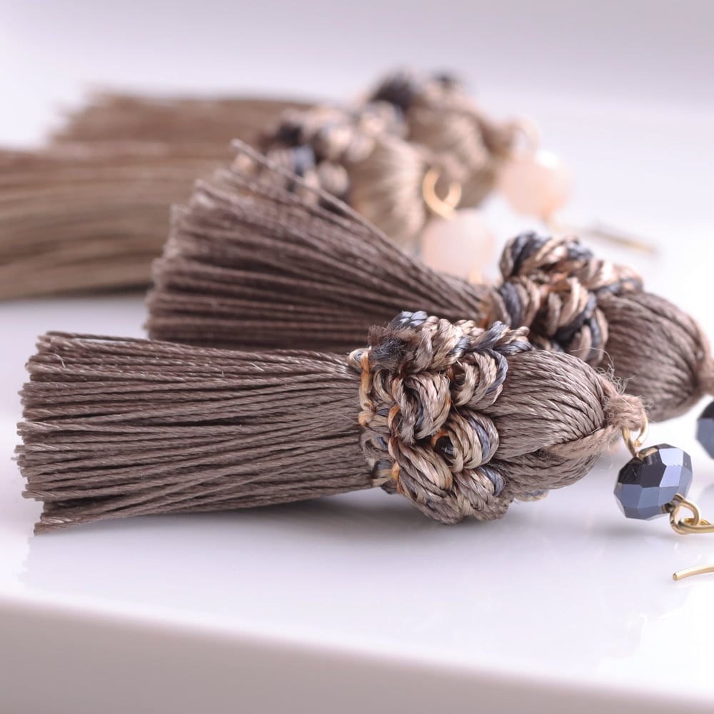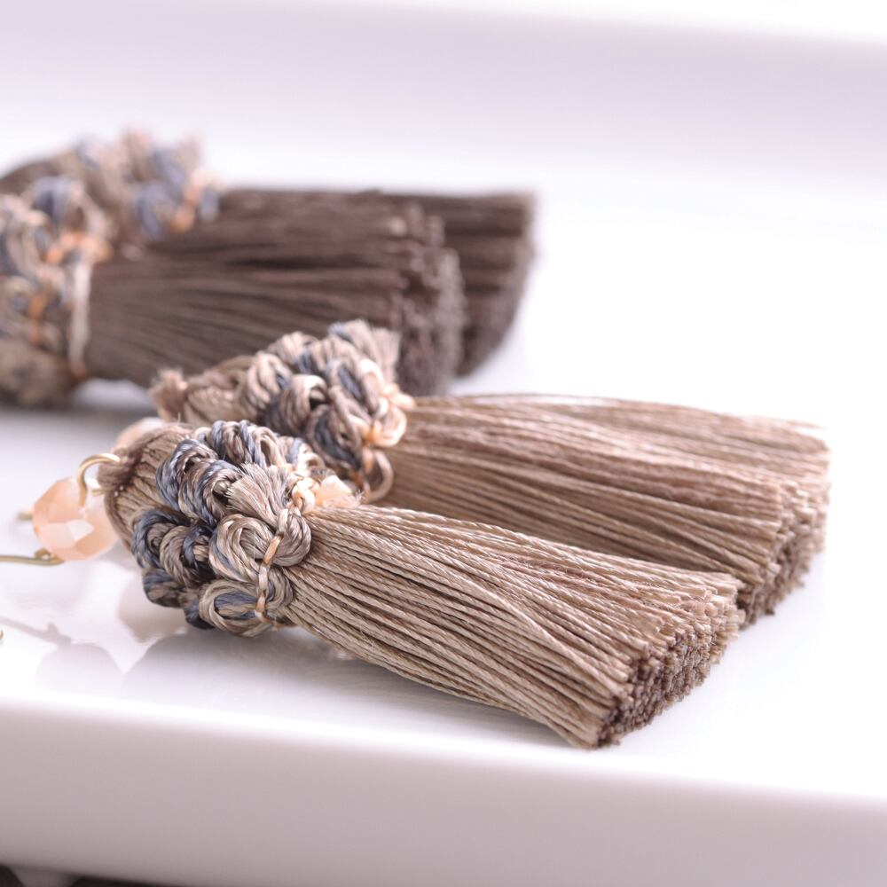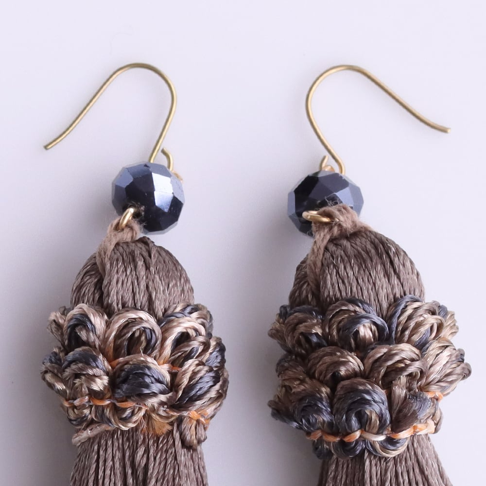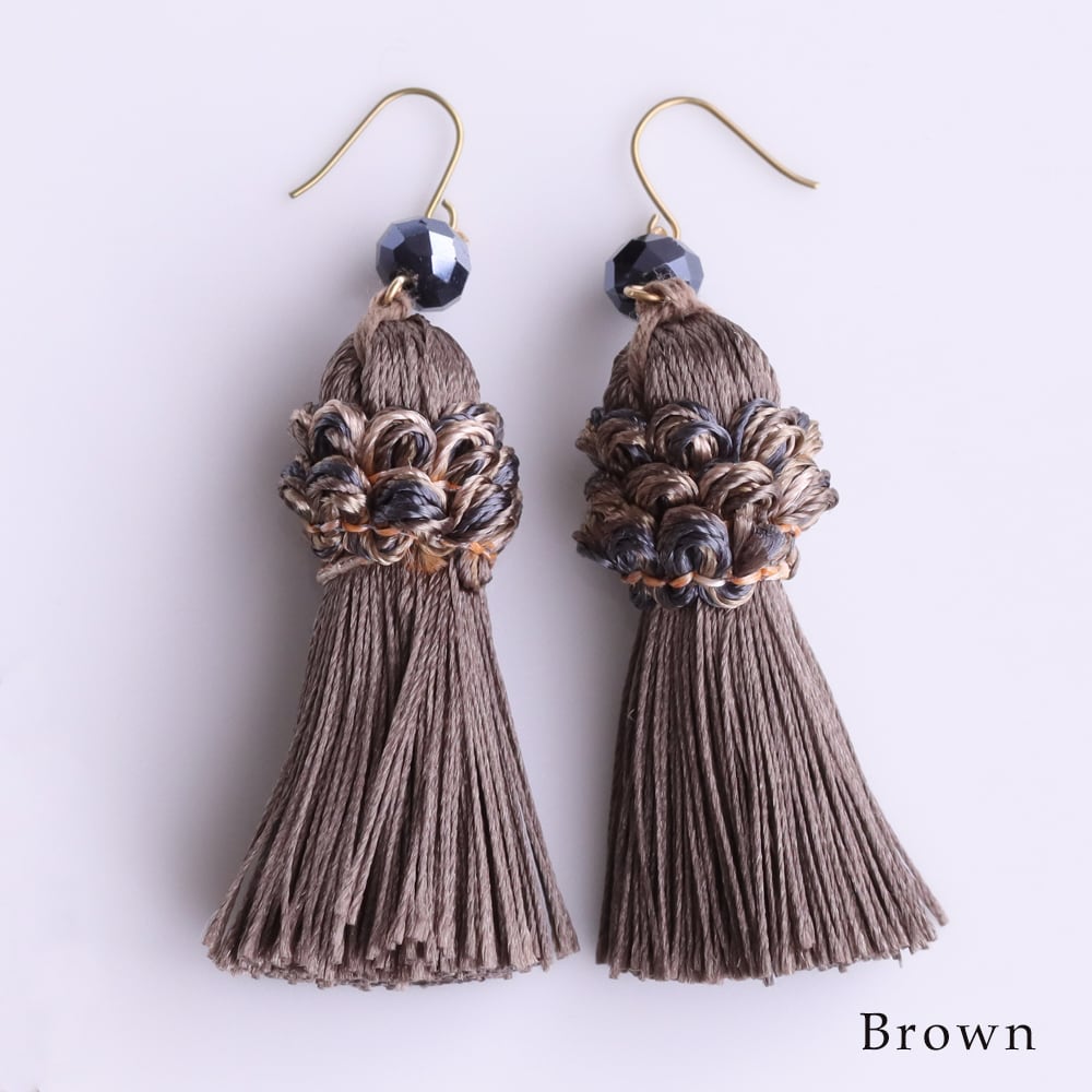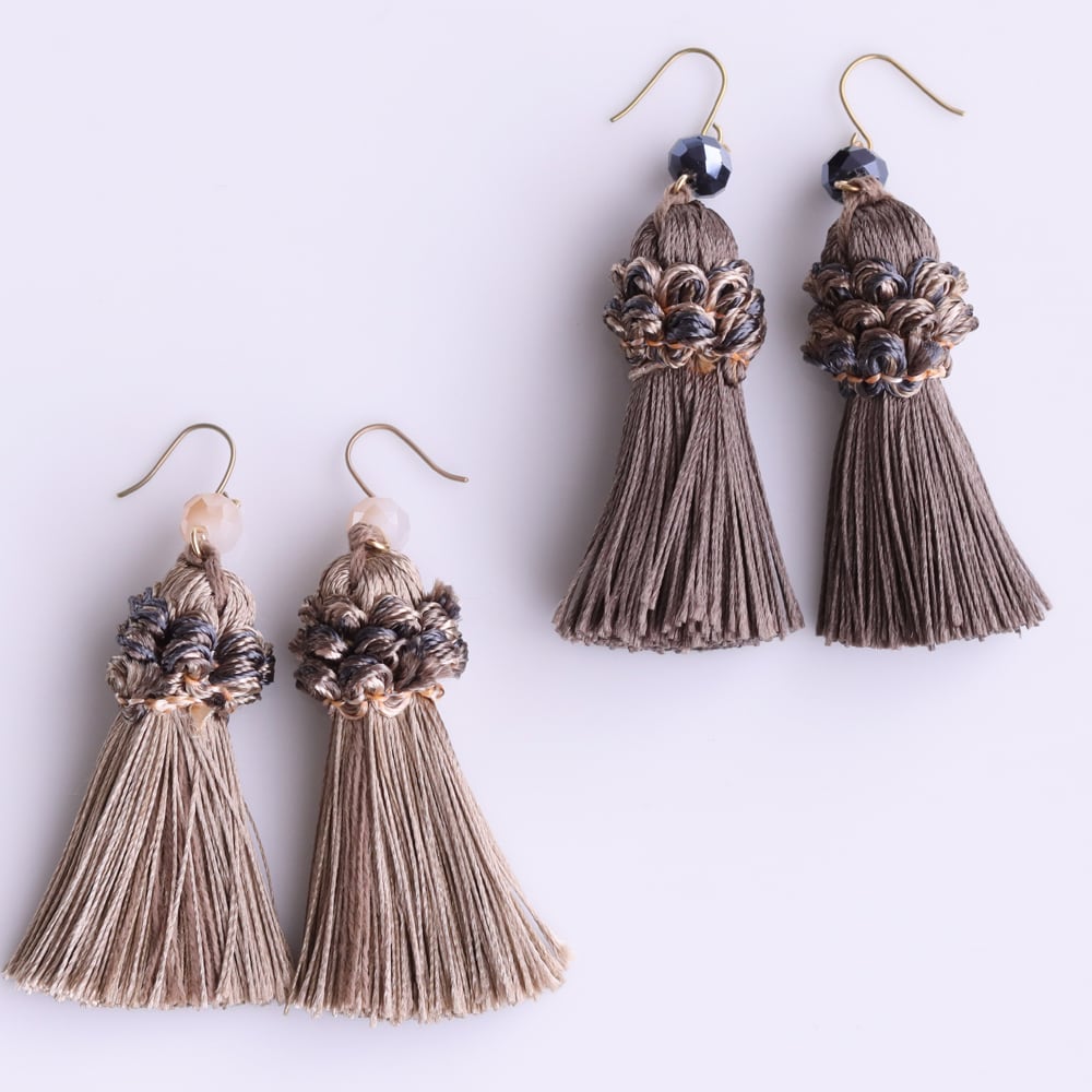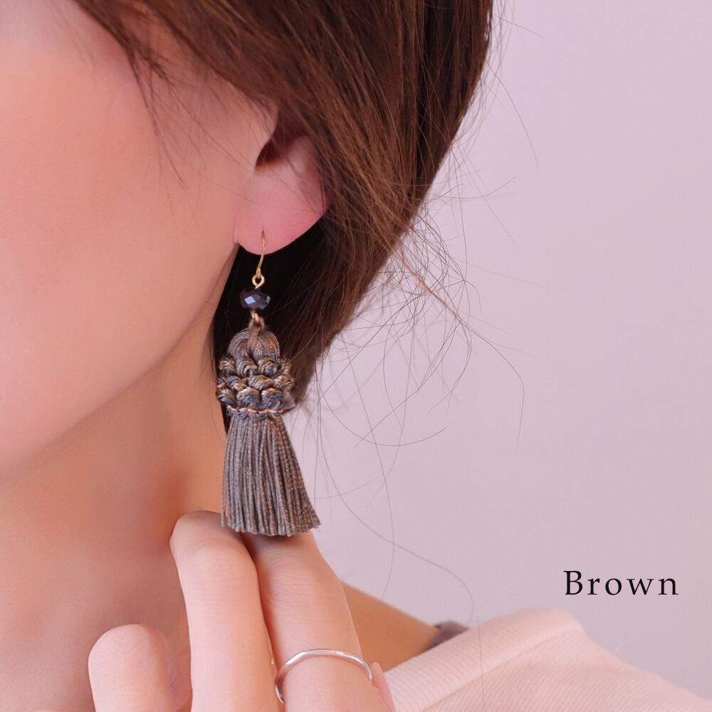 こっくりとしたココアブラウンのタッセルが、ヴィンテージ感をぐっと高める大人カラー。落ち着いたくすみトーンで顔まわりを上品にシェイプ。ブラックやネイビーのきれいめ通勤コーデ、秋冬のニット、ワンピースとも相性良好。深みのある色味で、ネイビーのビーズとも好バランスです。