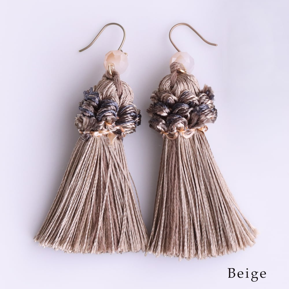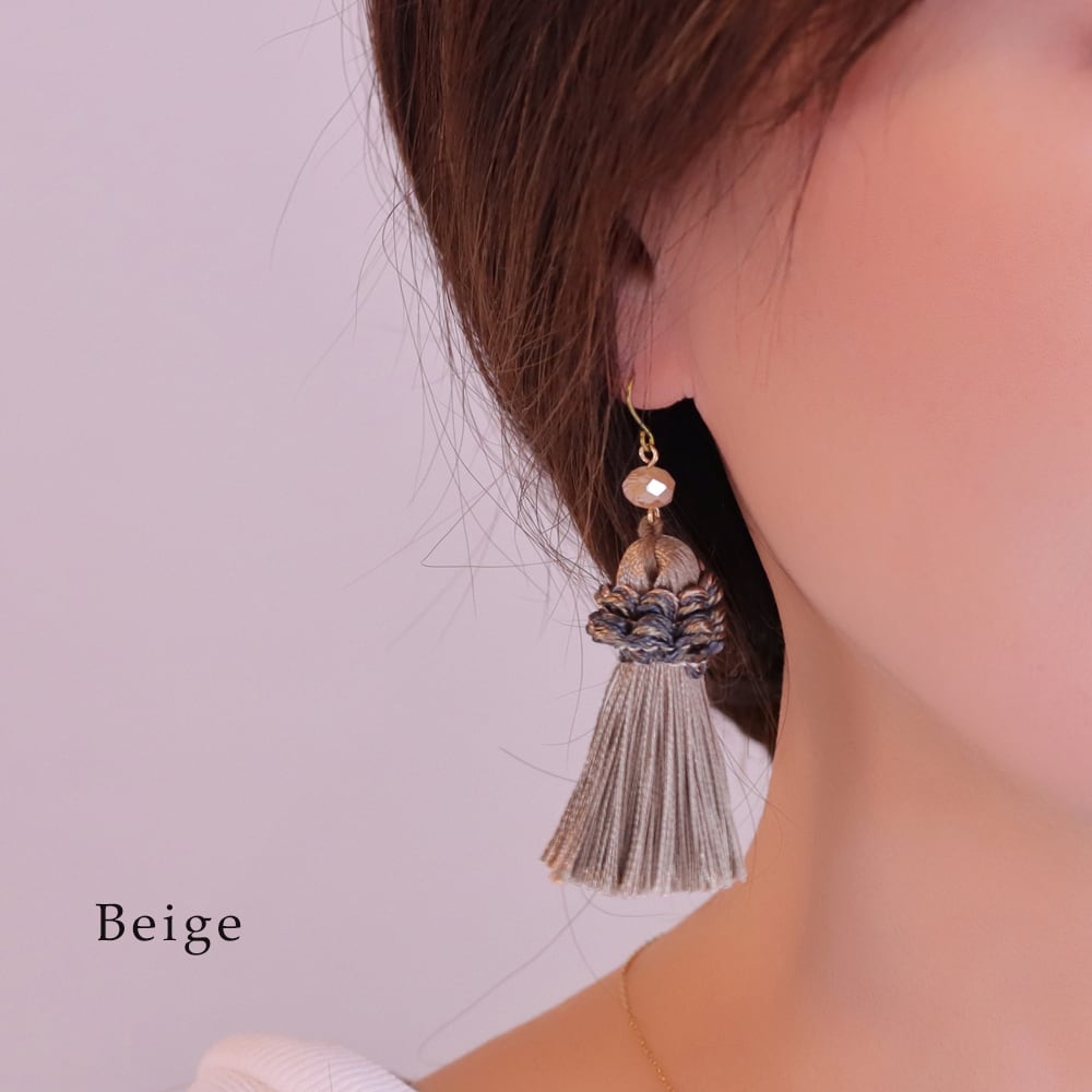 アンティークな雰囲気を纏う、絶妙なくすみカラーのタッセルが主役。ふんわり揺れるボリューム感と、手仕事感のある編み込みモチーフが耳元にニュアンスをつくります。