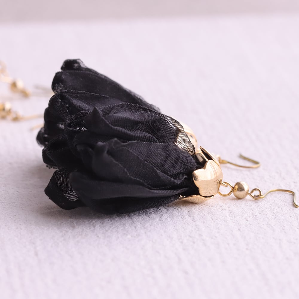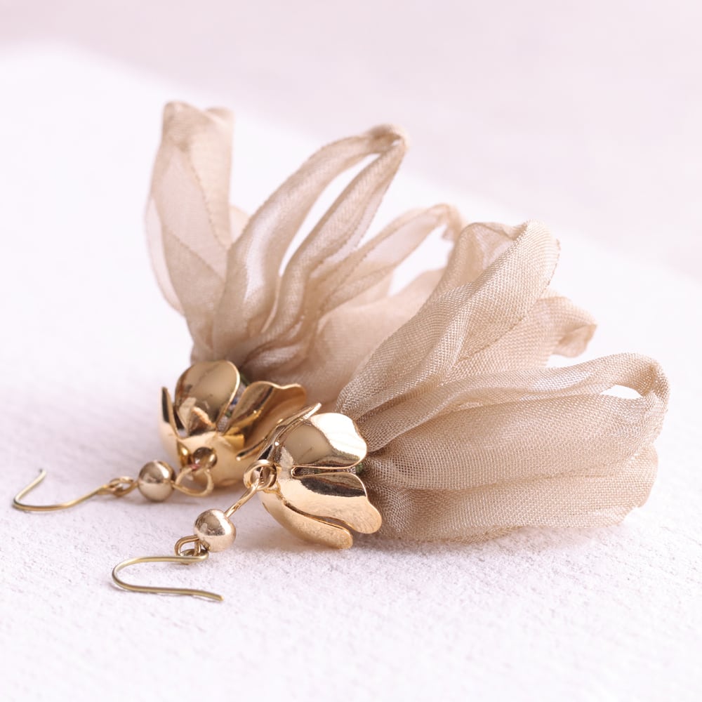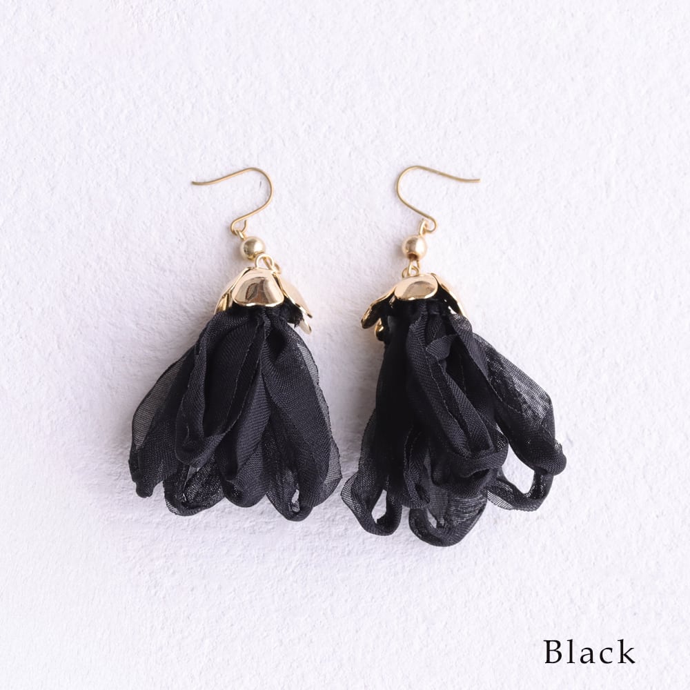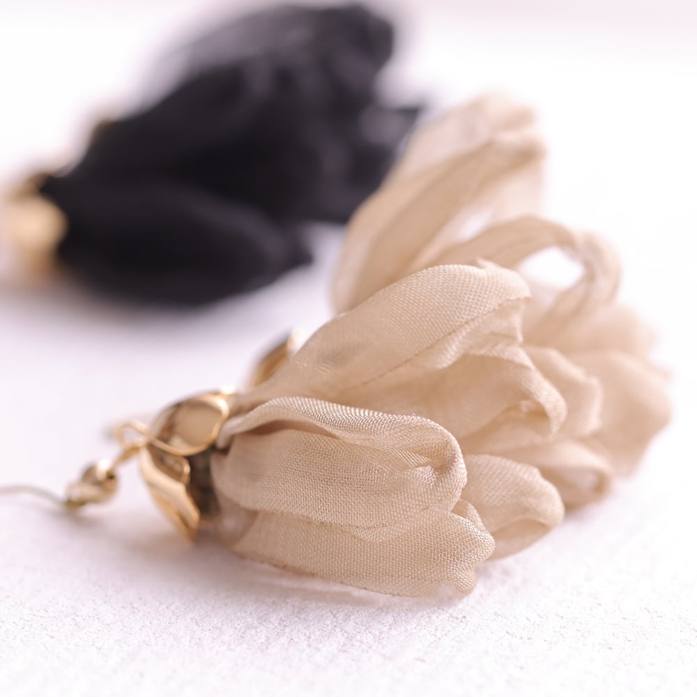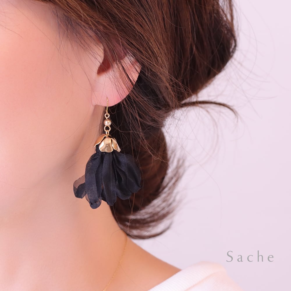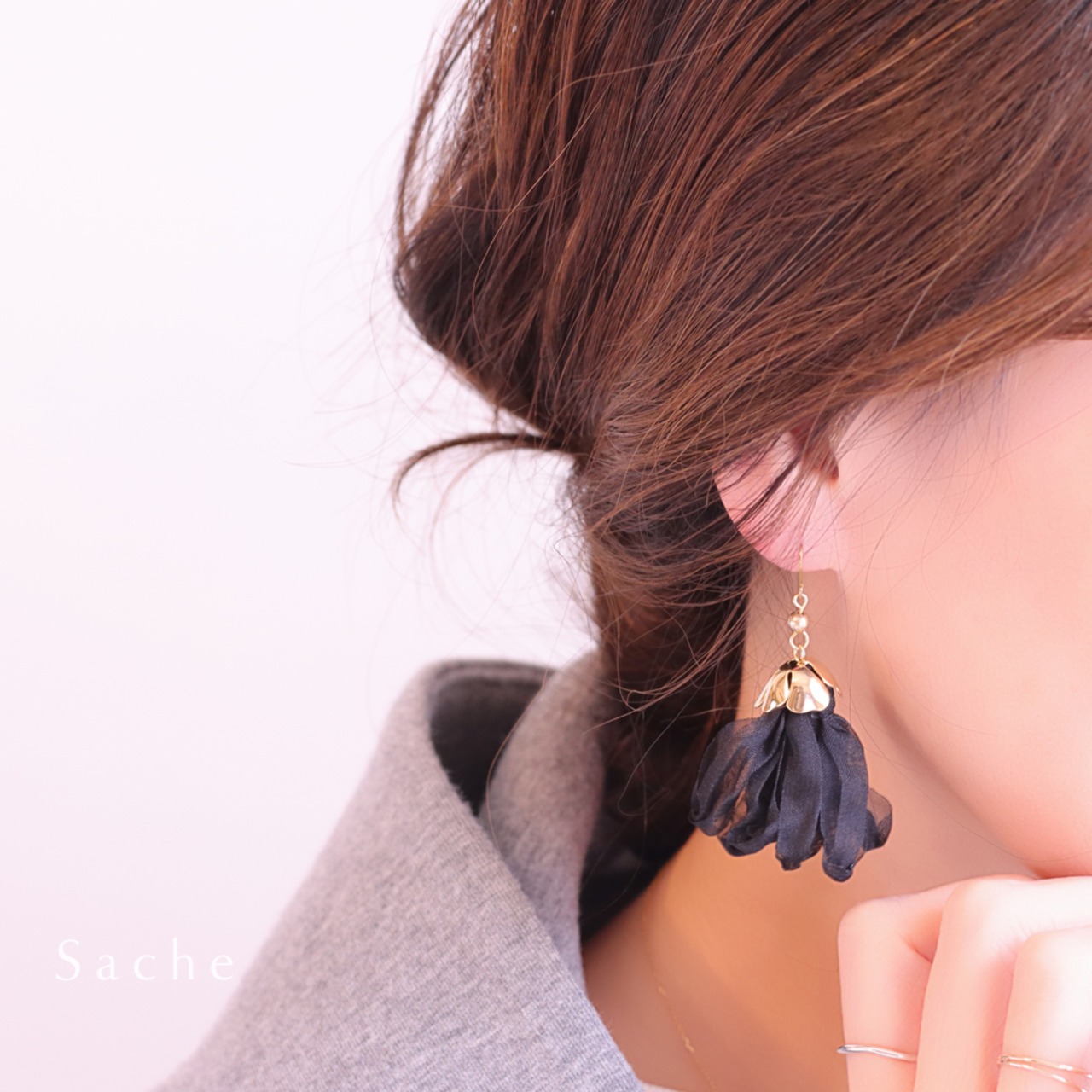 ふわりと空気をまとって揺れるシフォンが、顔まわりにやわらかな陰影と華やぎを添える「シフォンピアス」。