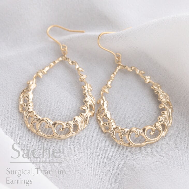 【値下げしました】ピアス 金属アレルギー 純チタン マットゴールド /商品名:【サージカルステンレスピアス】アラベスク フープピアス(サージカルステンレスフック・純チタンフック・イヤリングから選べる)
