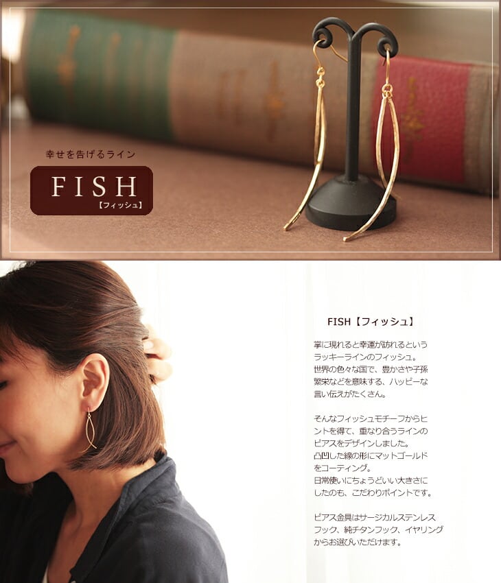 ピアス 金属アレルギー【GINGER掲載】ピアス 純チタン 揺れる マットゴールド /商品名:FISH(サージカルステンレスフック、純チタンフック、イヤリングから選べる)