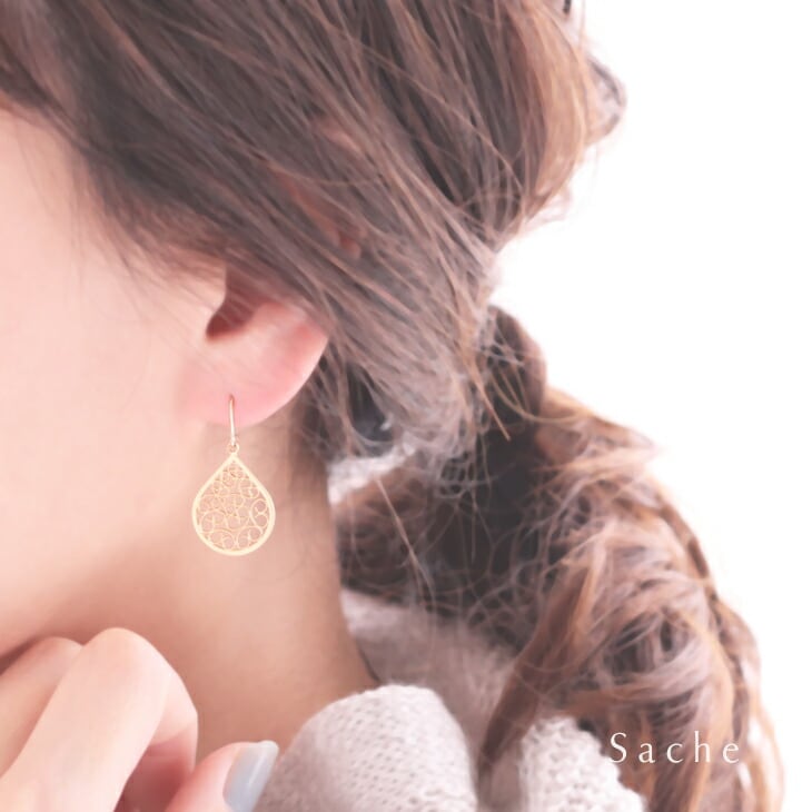 ピアス 金属アレルギー 純チタン マットゴールド ドロップ 雫 透かし彫り/商品名:Laila(サージカルステンレスフック、純チタンフック、イヤリングから選べる)